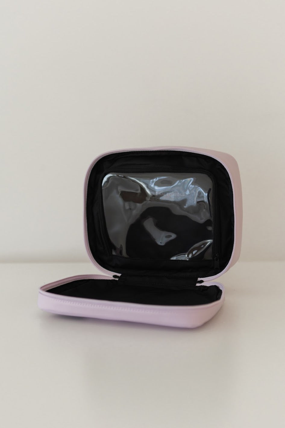 Travel cosmetic bag with a dedicated compartment to fit about 10 Clean Towels XL, available in light pink